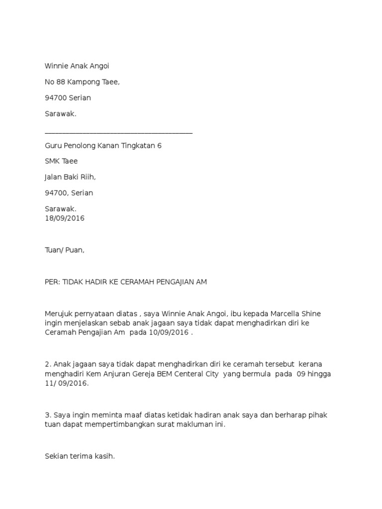 Surat Tidak Hadir Ke Sekolah Yang Mudah Dan Ringkas Azhan Co